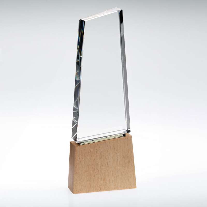 CLEAR GLASS BLOCK ON LIGHT WOOD BASE WITH COLOUR FLASH (32mm THICK) – 8.75in