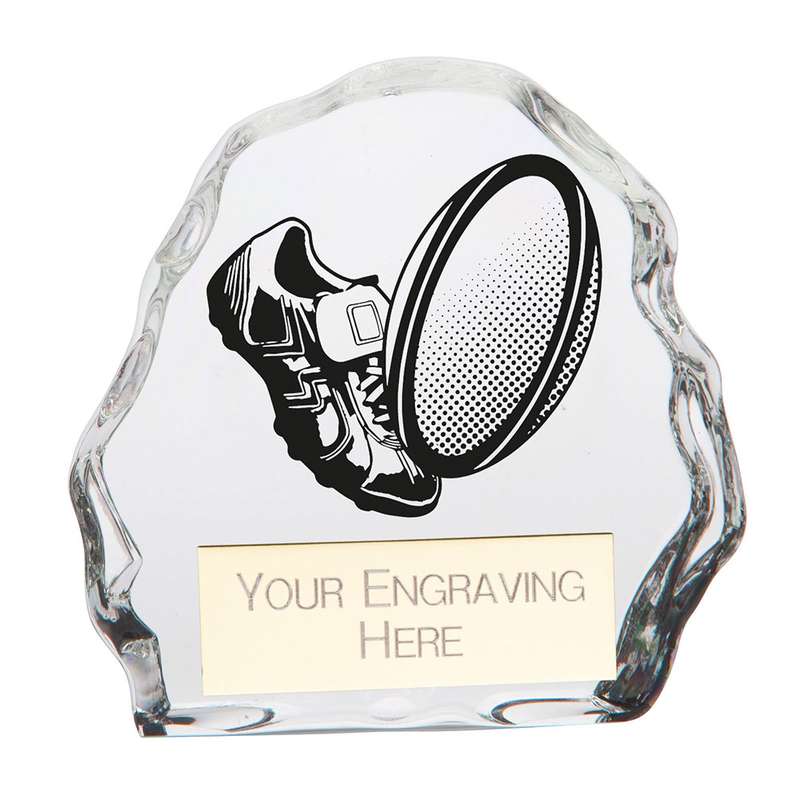 Discover the Mystique Rugby Glass Award, perfect for corporate rugby events. Available in various sizes. Shop now at Spa Trophies Ltd!