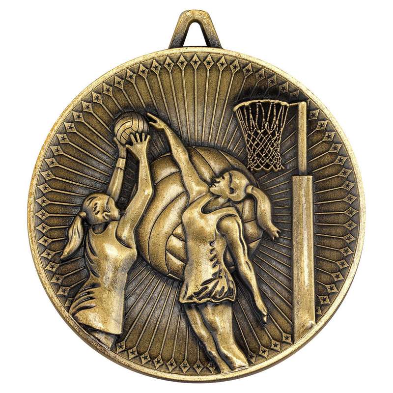 NETBALL DELUXE MEDAL ANTIQUE GOLD - 2.35in quantity